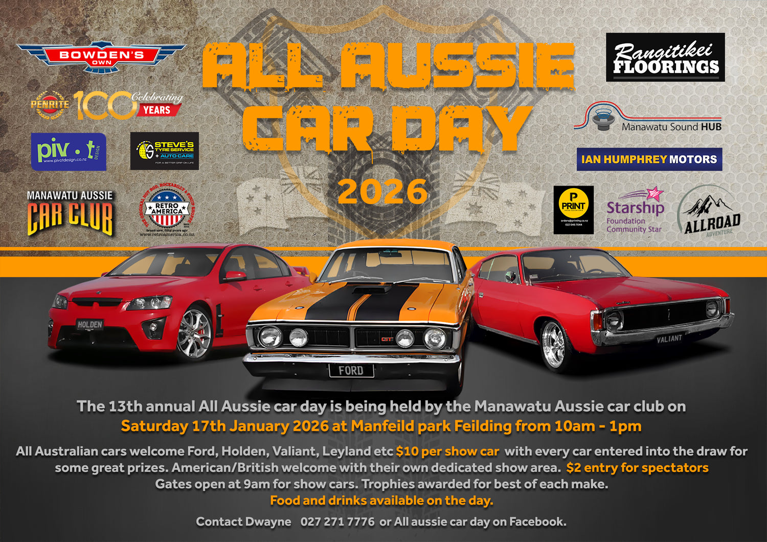 Entry on the day is $10 per Show Car and $2 for spectators. The Manawatu Aussie Car Club will be donating all proceeds to the Starship Foundation.