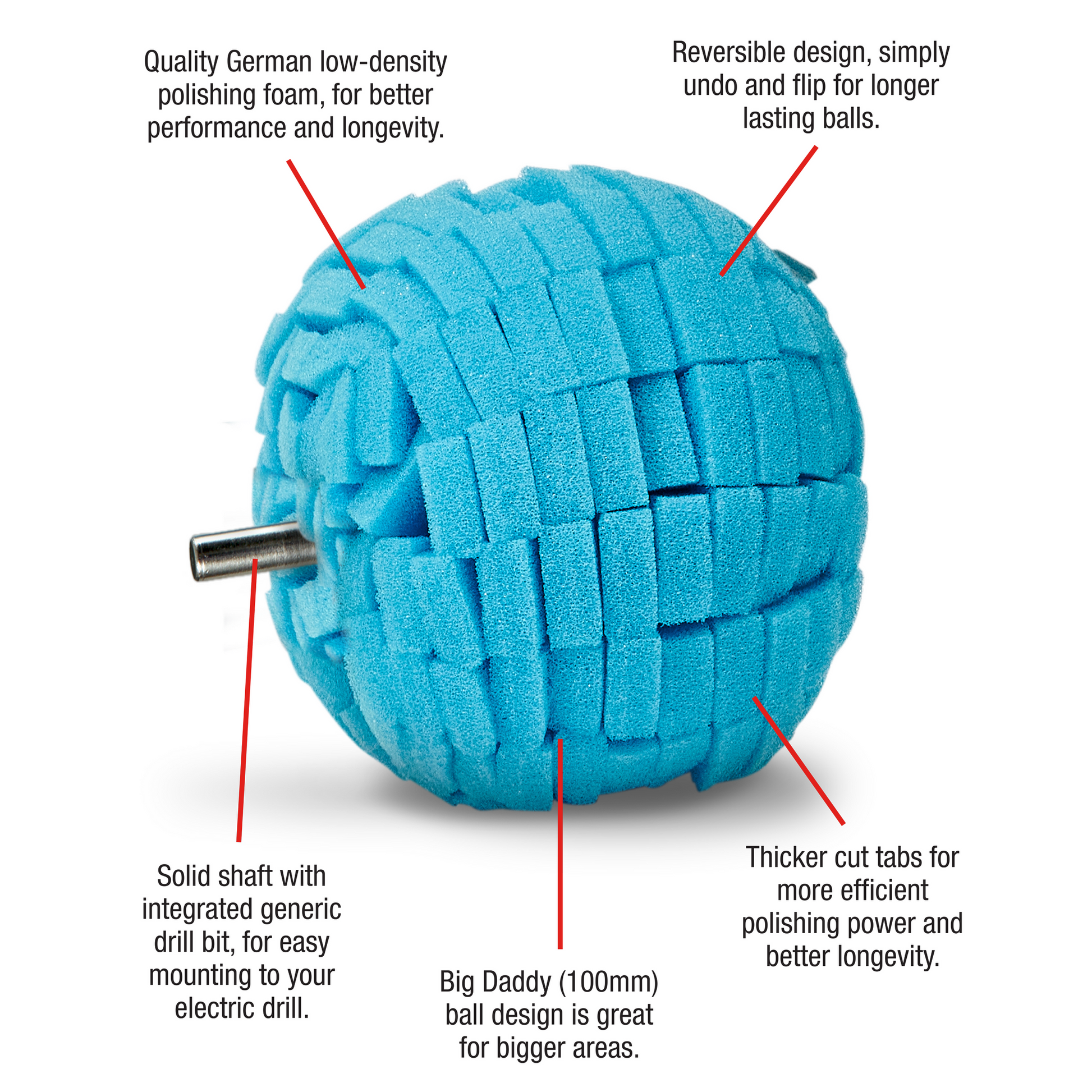 The Blue Ball Big Daddy makes bigger metal polishing jobs so easy, you’ll never polish by hand again. You’ll get stunning results when used with an electric drill and our metal polishes on non-coated and polishable alloy, stainless, billet wheels, bull bars, checker plate, fuel tanks and more. Made with a high quality, German low-density foam with thicker cut tabs for more efficient polishing power and better longevity.