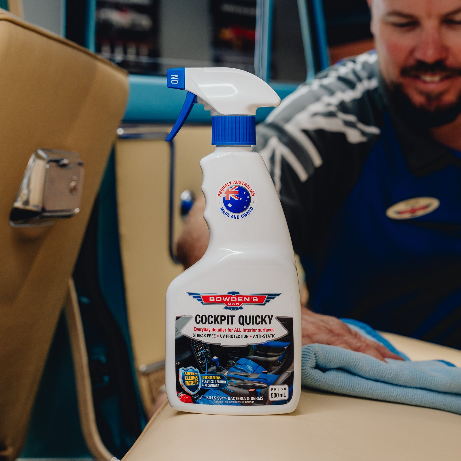 Cockpit Quicky does exactly what it says: super quick and easy cleaning of your cherished vehicle's cockpit. This fast and easy everyday interior detailer will safely clean and protect all your interior surfaces with a streak free, UV protected, anti-static finish. Ideal for modern touchscreens, as well as all plastics, vinyl, leather & Alcantara, while killing 99.99% of bacteria & germs.