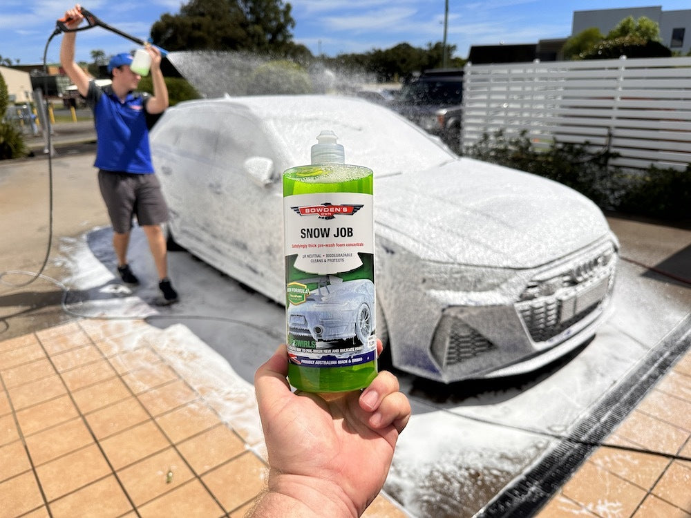 We're bringing snow to all parts of the country with this effective, deep cleaning Australian developed and made pre-wash foam that we call Snow Job. It's been created for regular use on all cars, modern and classic, even those with sensitive paint finishes. The thick and long-lasting foam blankets the car, to loosen and dissolve heavier contaminants, oils and grit from the painted surface, so you're no longer grinding this dirt and grit into your paint while you wash.