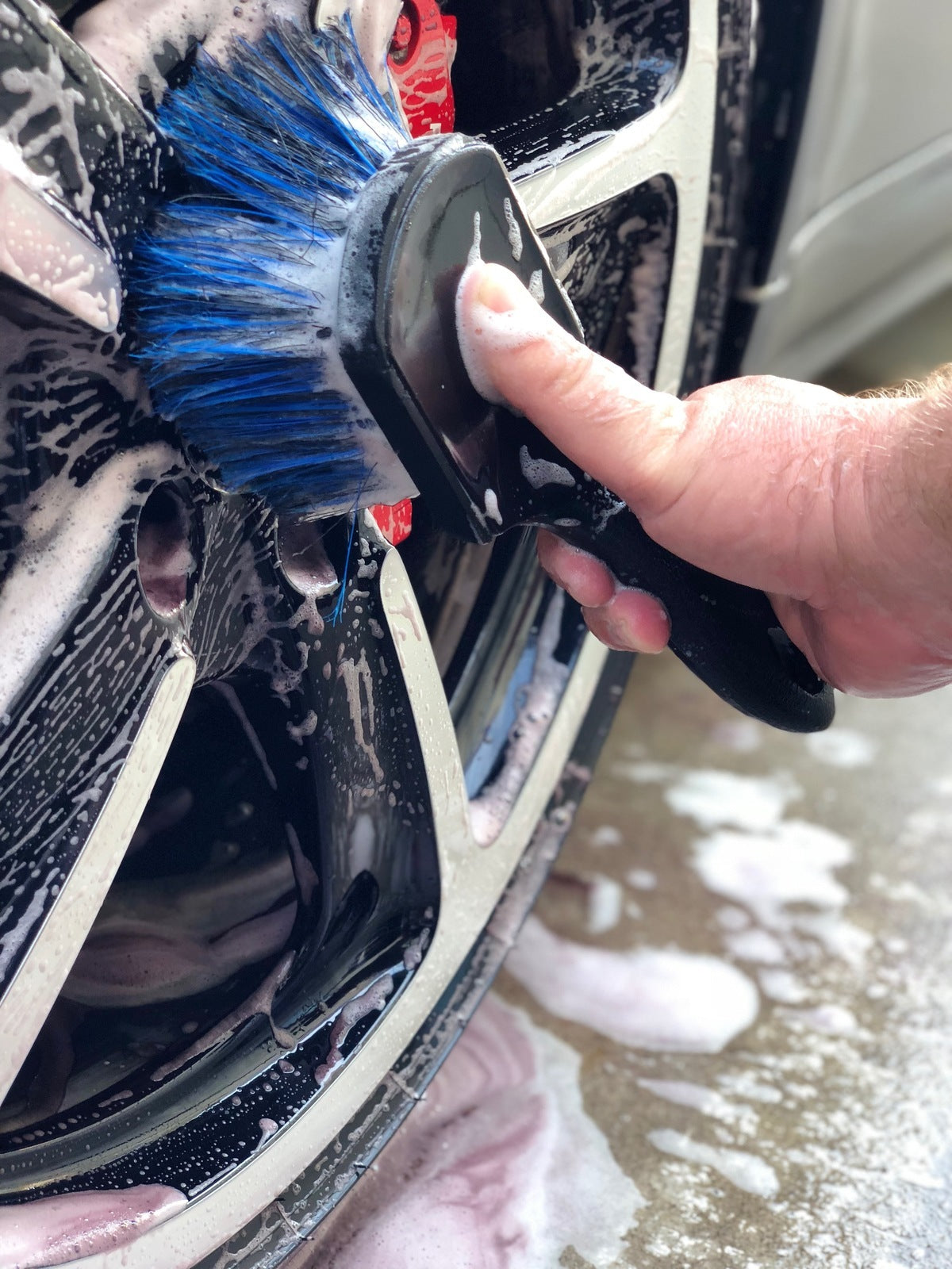 The Little Chubby was custom created for us by a local Queensland brush maker, to suit more obsessive fanatics who wanted to safely detail delicate and expensive wheels. Using a solid plastic construction, we chose a soft synthetic bristle as our testing found the natural bristles would become brittle and damaged over time. This 5cm deep bristle will remain flexible, soft and very effective for years of great detailing. It also uses splayed out and sturdy feathered bristles, to be effective enough for the tougher detailing jobs, yet gentle and long lasting. We also added a chemical resistant neoprene bumper to further reduce the chance of ever harming your wheels.