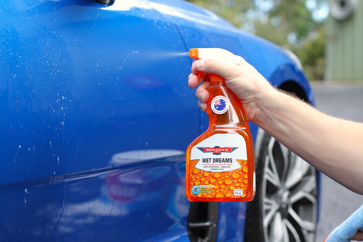 A fantastic spray-on, rinse-off protective sealant that we use at the end of a wash. This is for fanatics who want a fast way to boost of shine and get super hydrophobic protection without the need for a pressure washer when detailing their cars. The way it works on a still wet surface is a total dream, hence the name Wet Dreams.